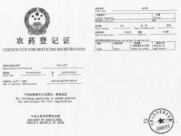南龍95%硫雙威原藥農(nóng)藥登記證