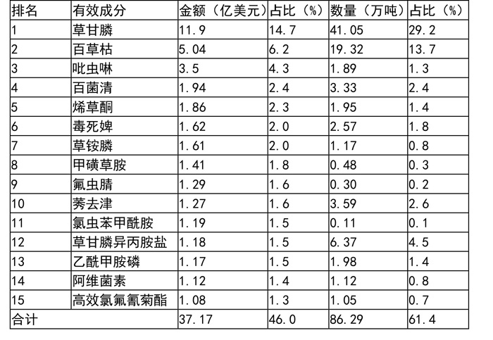 2018年出口品種TOP15中殺蟲劑7個、除草劑7個、殺菌劑1個(表1)。